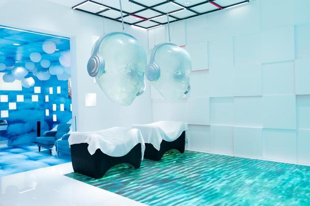 由音乐制作人吴金黛打造的视听舒适区,为体验者带来一场“颅内森林剧场”。空间冷色调、满满金属感让人感觉进入了科技的黑匣子,身处其中,聆听大自然的声音,配合巨型屏幕上呈现的森林原貌,高品质的声音和视觉享受成就剧院级的沉浸式体验。