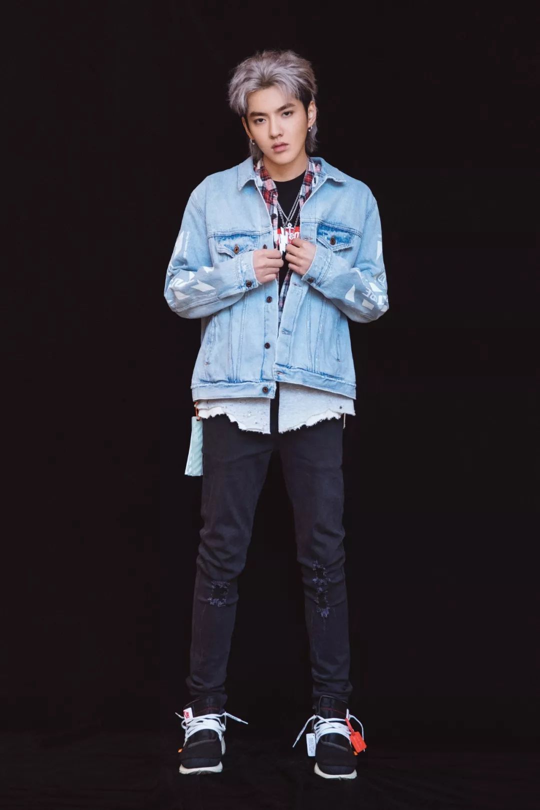 吴亦凡用牛仔夹克内搭红色格纹衬衣和supreme红色logo黑色T恤,下穿黑色牛仔裤,脚踩Nike x Off White黑色球鞋。配上这发型,永远走在潮流的最尖端。