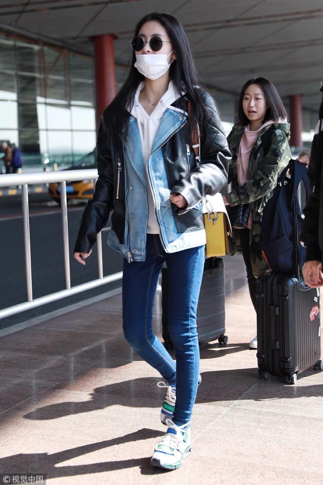 乍暖还寒时,牛仔布拼接机车夹克+内搭白色帽衫,下搭深蓝色紧身牛仔裤,张碧晨用两件创造四件叠穿视觉效果。