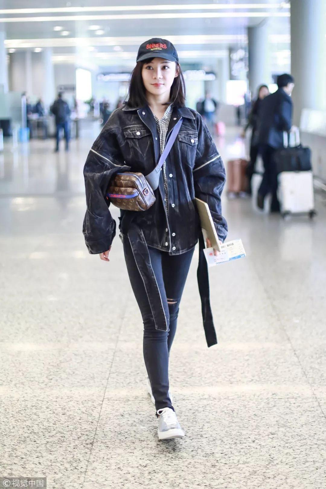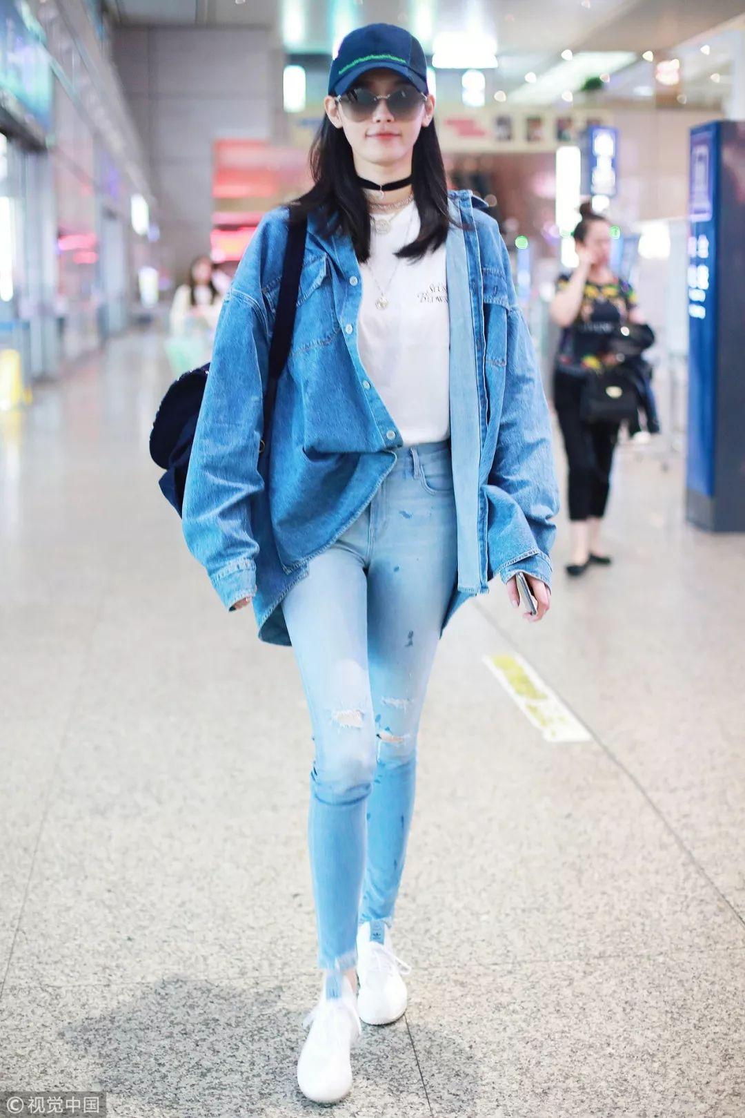 徐璐两天都是一样的搭配,破洞牛仔风衣长外套+白色字母T恤,大概真的是这个季节机场最舒适的look了。