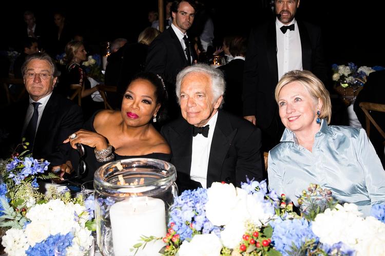 周年大秀邀请了 500 位嘉宾,这份包含时尚、媒体、零售、政界的名流清单很可能绝无仅有:希拉里·克林顿身穿淡蓝丝绸,两边有保镖守卫;第五任“邦德”皮尔斯·布鲁斯南和奥普拉坐在一块;罗伯特·德尼罗和斯皮尔伯格距离不远,还有安妮·海瑟薇、新订婚的尼克乔纳斯夫妇……所有美国时装屋的设计师可能都来了,Calvin Klein、Michael Kors、Donna Karan、Thom Browne,其中不乏老拉尔夫·劳伦当年的学徒,也偶尔装界的新人,比如说唱歌手 Kanye West。