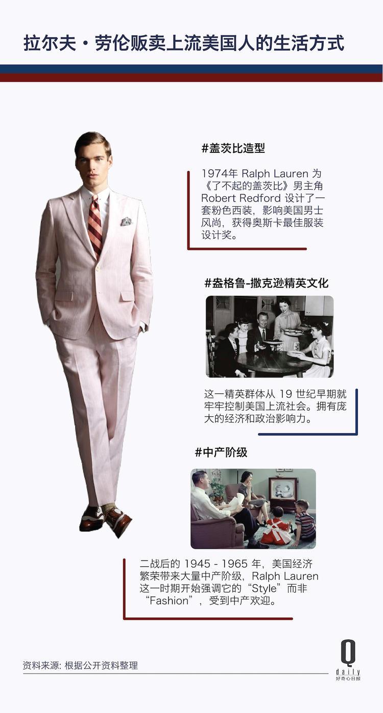 与大洋彼岸的欧洲同行们迥异的是,拉尔夫·劳伦用一套全新的美国式的价值观建立起自己跨越 80 个国家的服装帝国,他既能够展现贵族般的奢华,也可以做出粗犷实用的衣服。在半个世纪的服装和广告中,他引用了菲茨杰拉德笔下的盖茨比、华尔街银行家、落基山牧场主、西部牛仔等等远离大部分人生活的那群人的生活方式,然后把这套生活方式贩卖给不打马球的中产阶级。