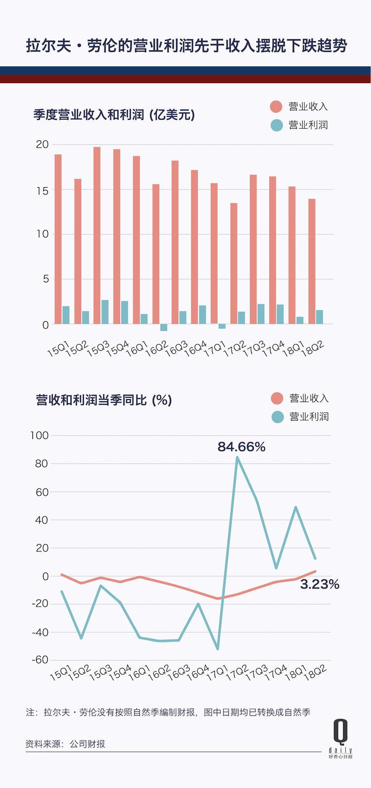 由宝洁出身的新任 CEO Patrice Louvet 领导下的拉尔夫·劳伦,在最近几个季度似乎已经摆脱了下滑的泥沼,这主要得益于公司在 2018 财年关闭了 25% 的美国百货商店分销点、31 家直营零售店。同时,拉尔夫·劳伦计划在未来五年增加 1 亿美元的营销支出。紧接着 Stefan Larsson 上台的还包括集团聘请的第一位首席营销官、从近两年数字化表现亮眼的 Burberry 跳槽来的 Jonathan Bottomley。Bottomley 为品牌制定了新的分层营销策略,将更多利用 Instagram、微信等新媒体传递美国品牌的价值。
