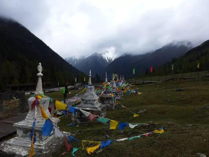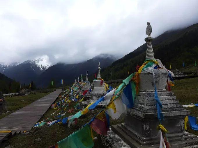 在牛棚子,傲立于草甸的白塔,映衬于雪山之下,神秘圣洁;五彩经幡随风飘动,送去藏民为众生的祝福,享受美景的同时,赞叹着藏民的善良与坚定。