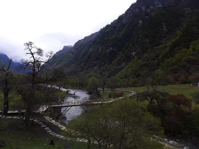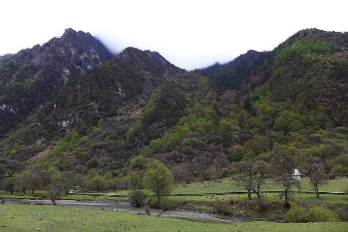 沿着人参果坪的小溪漫步,放眼坦荡妩媚的草地,这里山水相依、草木相间、云遮雾绕,透过沙棘树沿溪流回望,云雾笼罩的青山、沙棘树丛、潺潺溪水和牦牛构成了一幅和谐画卷。