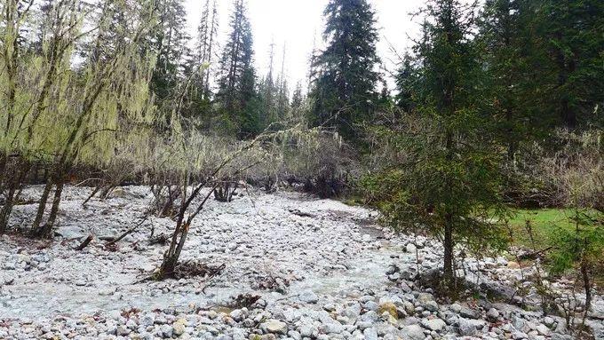 在雨中,沟里的海子、枯树、山峰、牦牛、白塔、经幡,仍构成了一幅美丽的画卷。在盆景滩,可以饱览高原湖泊的美丽、枯树的刚毅、牦牛的悠闲。