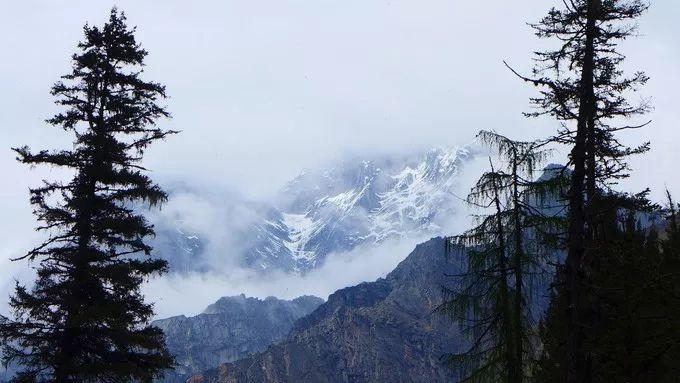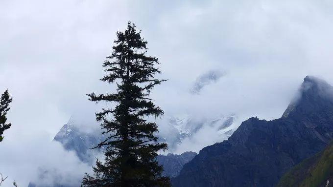 沟尾三面环山,尽管雨雾蒙蒙,仍能看到不远处的雪山,雪线以上的山峰是黑褐色的岩石,山巅覆盖着冰雪;雪线以下便是红杉林带来的生命色,其雄伟冷峻让人肃然。那隐匿在云雾背后的雪山又该是怎样景象?沿着栈道,在红杉林中环绕了一周,红杉树挺拔昂扬伸向天空,全不在意游人的打扰;这里海拔在3800m以上,置身山谷和高高的红杉树下,会深感人的渺小。