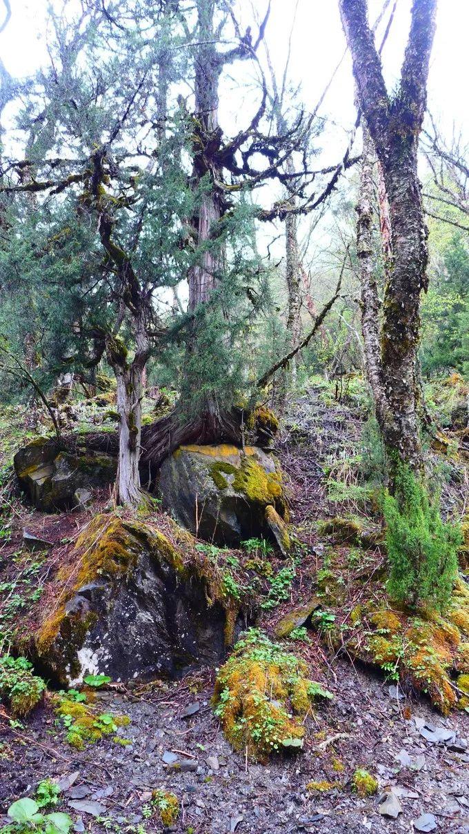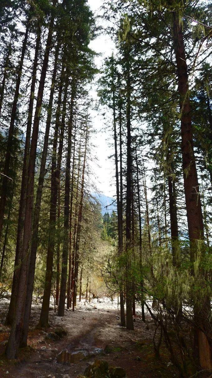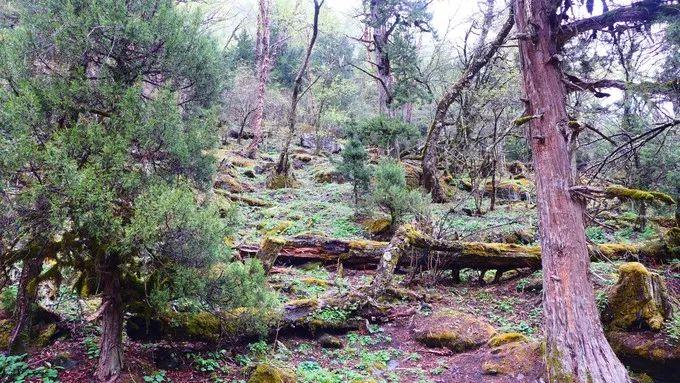 走在唐柏古道,各种植物遮天蔽日,成片的千年原始森林里,古柏高大挺拔,青松枝密叶茂;它们或古老苍劲,或盘根错节;年代久远的挂满了树挂面(学名:苔醉),有的牺牲自己孕育了新的生命;没有人打扰,没有人砍伐,自生自灭,一切是那么的自然和谐。