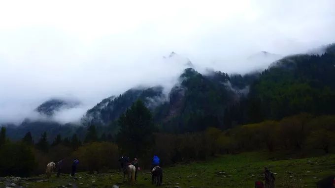到达木骡子,豁然开朗。前面有一片开阔的草甸,小溪在这里静静地流淌,牦牛、马儿在这里悠闲的生活。这里本该是观赏四姑娘山风姿的最佳地点,可惜天公不作美,四姑娘躲在了云雾中。先吃午饭,等待着天公揭开四姑娘的面纱。席间,与同伴感慨起来,当初红军爬雪山可不是都有马骑,也没有羽绒服、旅游鞋,更没有面包、香肠、方便面,如何能翻过雪山、走出草地?那是怎样的信仰支撑着他们?不敢想,没有马,我们肯定走不到木骡子。约20分钟后,云慢慢退去。按照当地人的指引,我们在空中搜寻着四姑娘的身影。还好四姑娘掀开了一小片云雾,得以看见一点点真容。