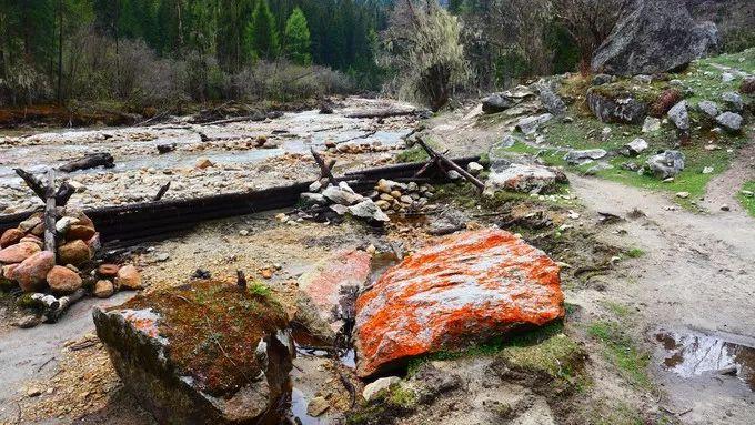 干海子不是湖,只是一片沼泽,白色的鹅卵石、绿植、苔醉也是一番别样景观 。红石阵,绝对是这里的撞色点缀,春天的长坪沟因为红石而艳丽。