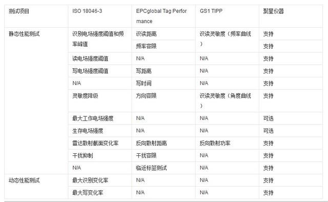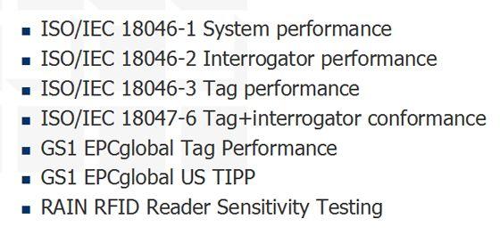 在RFID测试标准里面,RFID标签和读写器的测试有规范性测试(包括时序、波频、频谱等)和性能测试(包括反向功率、读距、反向距离等),RFID系统则包括效力测试和互操作性测试。