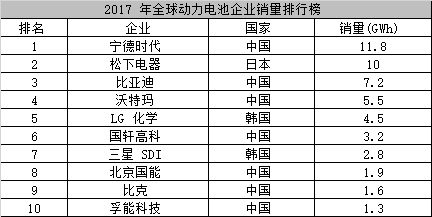 最近三年,宁德时代动力电池系统销量分别为2.19GWh、6.80GWh和11.84GWh。根据GGII 统计,公司动力电池系统销量连续三年在全球动力电池企业中排名前三位,2017 年销量排名全球第一。