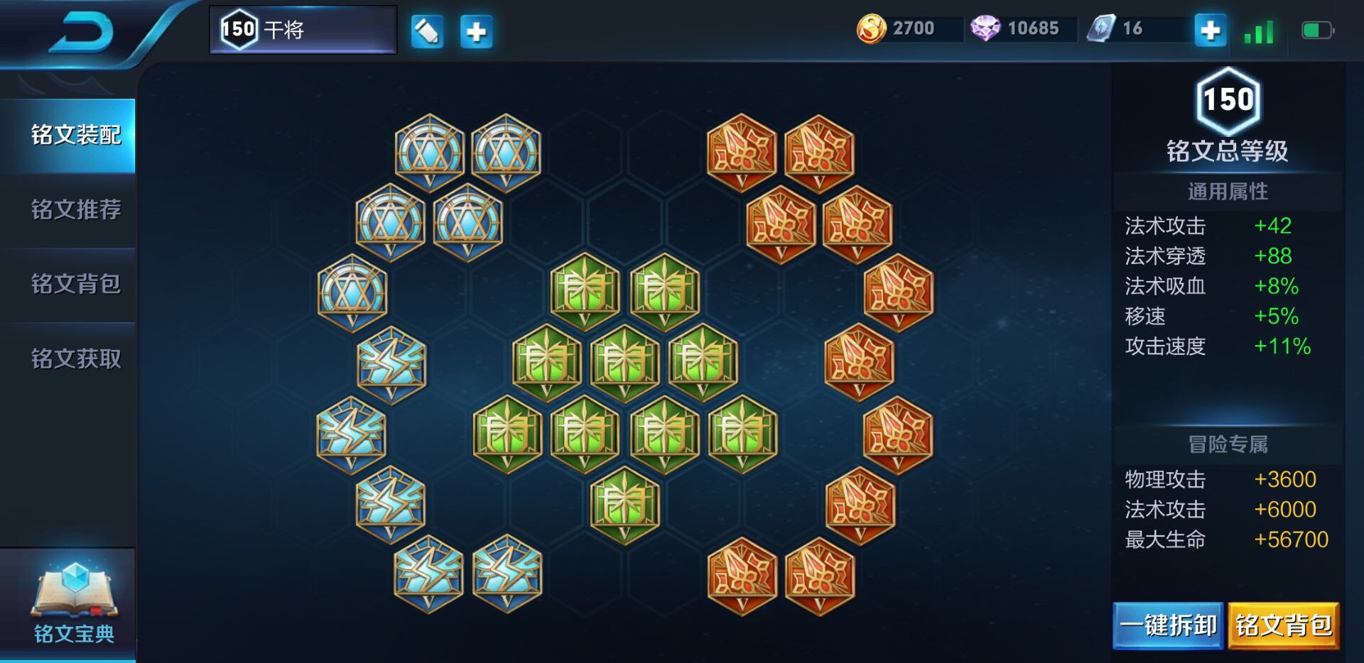 铭文推荐:蓝色5贪婪5狩猎+绿色10心眼+红色10梦魇,这套铭文能提高一点干将续航,以及游走能力,干将的技能范围能去边路或者下路去支援一下,就算没有gank机会也能去消耗一波,法术穿透极高提升了干将的输出能力。