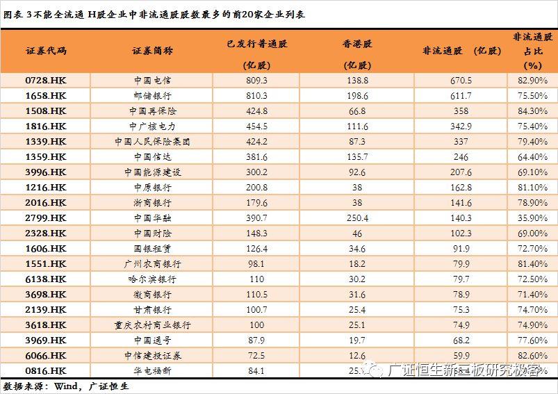目前不能全流通H股在全部H股上市公司中占比最多。港股市场中254家H股公司中,有155家公司属于不能全流通H股,非流通股总股数为5931.3亿股,占相应公司已发行普通股总股数8398.2的70.6%。将155家不能全流通H股企业按照非流通股股数的多少进行排序,中国电信(0728.HK)已发行普通股809.32亿股,其中可流通香港股仅138.77亿股,非流通股高达670.55亿股,占比82.9%。其次储蓄银行(1658.HK)非流通股数也较多,截至2018年3月15日,储蓄银行已发行普通股数为810.31亿股,其中非流通611.74亿股,占比75.5%。