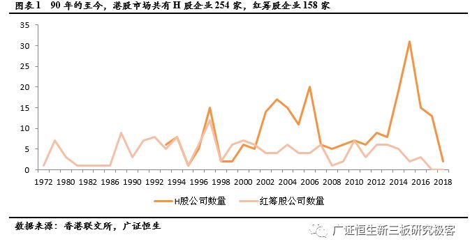 H股公司的出现较红筹股稍晚,但数量增长较快,1993年至今香港市场共有H股企业254家。H股经历过两次增加较快阶段,2002年到2006年,港股市场平均每年增加15支H股,2014年到2017年平均每年增加19支H股。