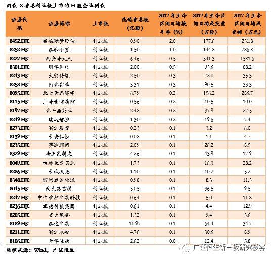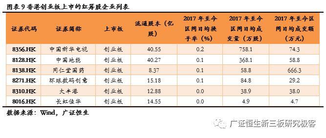 港股创业板市场中,H股和红筹股企业流动性表现较差,除富银融资股份(8452.HK)和泰和小贷(8252.HK)两家H股企业2017年至今日均换手率超过1%外,其余企业日均换手率均在0.1%-0.3%左右。2017年至今日均成交量超过500万股的企业仅一家,为红筹股企业中国新华电视(8356.HK),日均成交量为758.1万股,日均成家额为74.3万元。