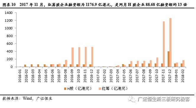 从月度数据上看,2016年至今,除年初个别月份外,红筹股企业融资额均远远超出H股企业。每年第四季度,是企业完成定增融资的高峰段。2017年11月,红筹股企业融资额为1176.9亿港元,是同月H股企业88.68亿融资额的13倍。2017年12月,红筹股企业共计融资1256.7亿港元,同样远超出当月H股企业的398.3亿融资额。