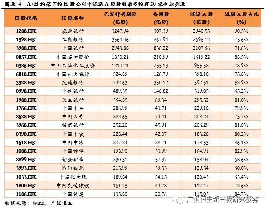 目前H股企业中,已有99家企业搭建了这种A+H模式,流通A股总股数为16679.83亿股,占相应公司已发行普通股总股数24361.25的68%。将A+H构架下的H股公司按流通A股股数进行排序,农业银行(1288.HK)已发行流通A股最多,为2940.55亿股,占全部已发行A股的90.5%。其次是工商银行(1398.HK)已发行普通股3564亿股,其中香港股有867.94亿股,流通A股有2696.12亿股,占比75.6%。