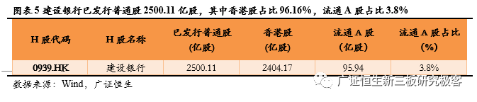 除了不能全流通H股和A+H构架下的H股公司外,还有一类H股公司是全流通H股。建设银行在赴港上市《招股章程》说明:“本行发起人持有的内资股将于全球发售完成后,转换为H股,并将于香港联交所上市。”并经中国证监会特批通过,建设银行(0939.HK)是现阶段唯一一家理论上全流通H股。同时建设银行也搭建了A+H股模式,目前其已发行普通股2500.11亿股,其中香港股有2404.17亿股,占比96.16%,流通A股有95.94亿股,占比3.8%。