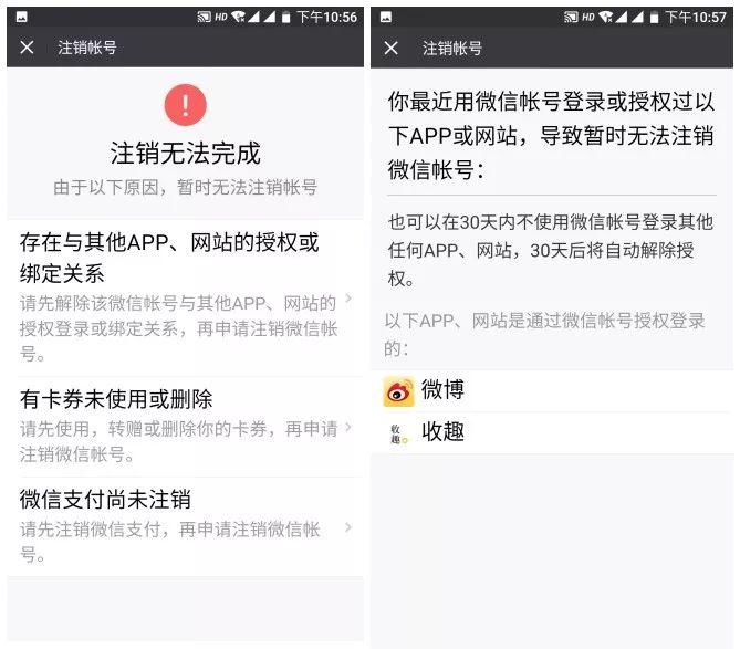 在注销账号前,微信官方会有“重要提醒”,即注销之后你会无法找回微信好友、丢失聊天记录等信息。申请注销失败的话,微信会给出什么原因导致暂时无法注销账号,按照官方给出的方案详情进行处理可完成注销。