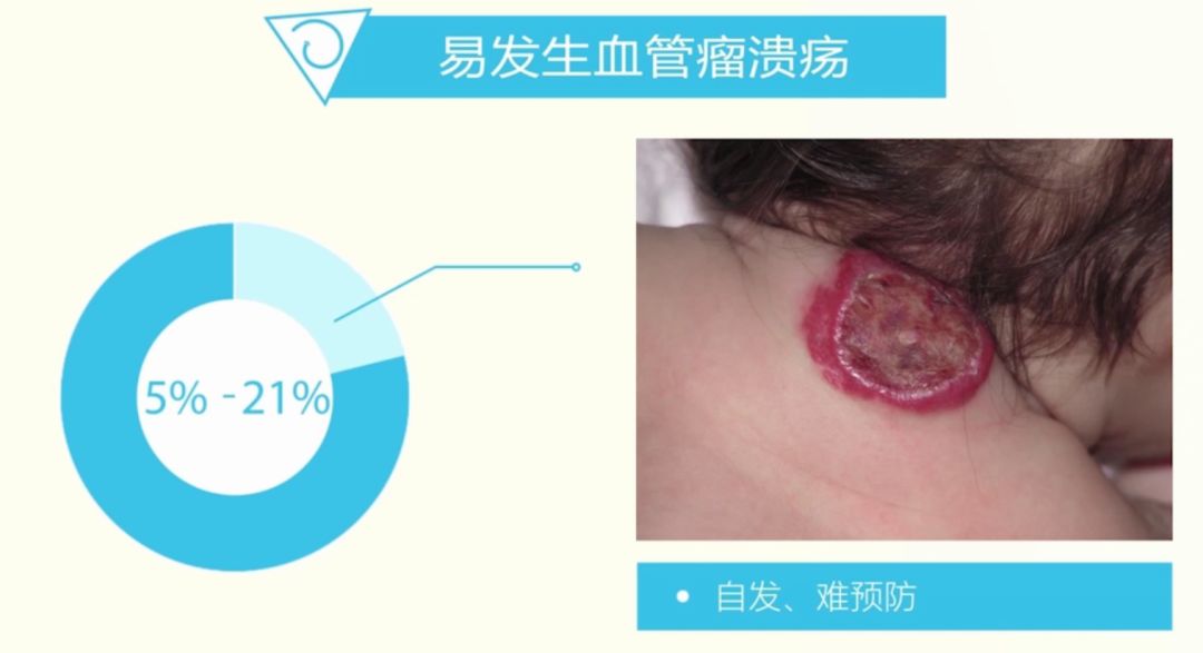 有5%~21%的婴儿血管瘤会发生溃疡,而且这种溃疡很难预防,一旦破溃后宝宝会感觉到很疼,且容易发生感染。