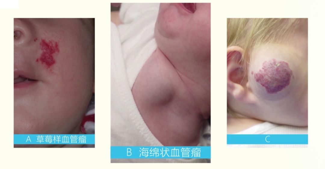 其中浅表血管瘤又叫草莓样血管瘤,颜色鲜红,表面有凹凸的手感,如下图A。