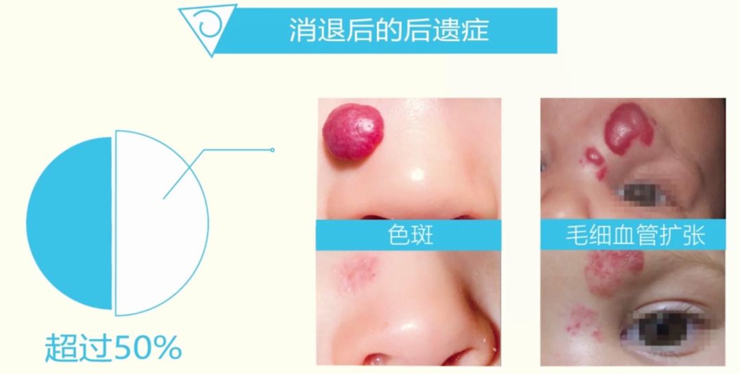 研究显示,血管瘤消退以后,超过50%会留下色斑、瘢痕、皮肤萎缩或毛细血管扩张等后遗症,如下图。