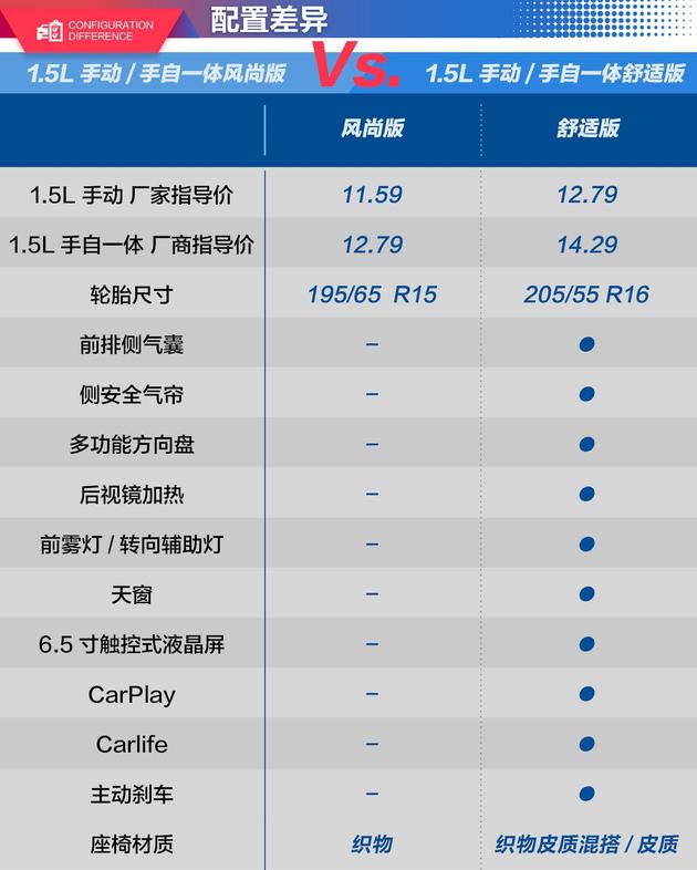 通过配置差异表我们可以看出风尚版和舒适版的差异主要在于舒适版增加了前排侧气囊、后视镜加热、多功能方向盘、天窗、6.5英寸寸触控式液晶屏、CarPlay/Carlife手机互联功能。