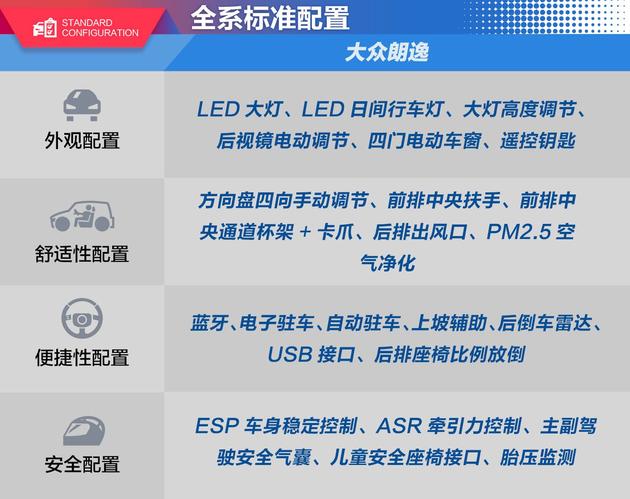 下面我们一起来看一看新一代朗逸各个车款的配置分布。作为上汽大众旗下的走量型选手,再加上11.59万的起售价,我们大概可以猜出新一代朗逸即便是入门版车款在配置上也不会含糊。都说买车讲求性价比,性价比就是最低配的车款也能满足用日常使用,接下来我们就下方的表格梳理一下,看看朗逸的标准配置都有哪些。