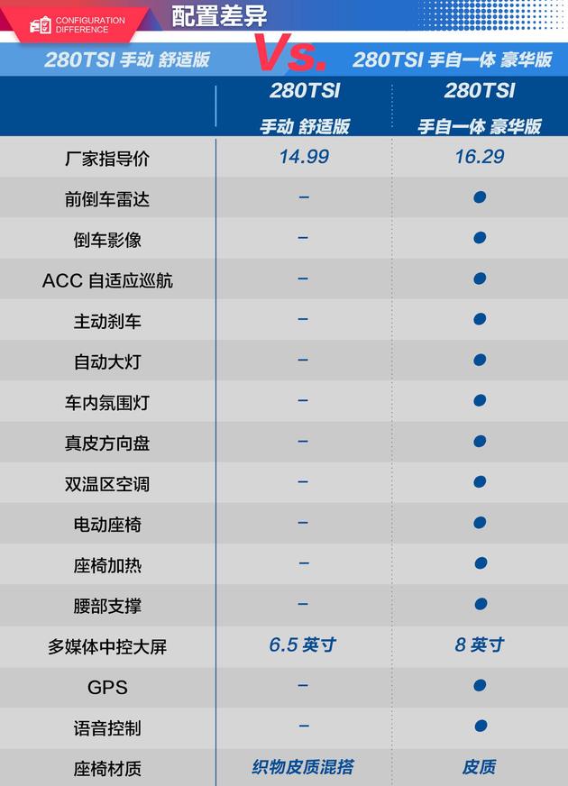 280TSI 双离合舒适版对比280TSI 双离合豪华版(差价1.3万元)