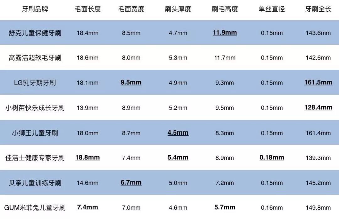 8款牙刷测量结果: