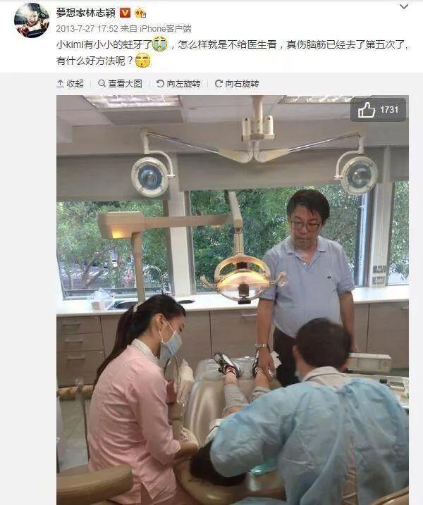 不老男神林志颖曾经在微博晒小志志看蛀牙的照片,并表示非常的苦恼,林志颖微博称:“小kimi有小小的蛀牙了,怎么样 就是不给医生看,真伤脑筋已经去了第五次了,有什么好方法呢?”