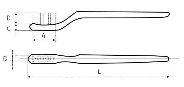 如上图,毛面长度(A)要求≤29.0mm; 毛面宽度(B)要求≤11.0mm; 刷毛厚度(C)要求≤6.0mm。 刷毛高度(D)平形毛刷要求:7.0~11.0mm;异形毛刷要求:5.0~12.0mm 牙刷全长(L)要求:110.0~180.0mm; 单丝直径 要求≤0.18mm。