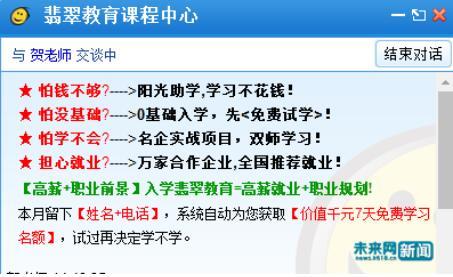 其实在工作教育领域,“先就业后付款”“学费不够帮*款贷**”是多家培训机构惯用的宣传招生手段。打开IT工作教育机构北风网、翡翠教育、北大青鸟等官网,不到3秒时间就会有其在线咨询老师的弹窗出现,弹窗中的信息也都大同小异,尽是“包就业”“高起薪”等字眼。