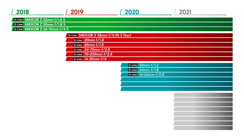 尼康的首批Z卡口镜头共有三支,包括一支用于套机的标准变焦镜头(Nikkor Z 24-70mm f/4 S)和两支大光圈定焦镜头(Nikkor Z 50mm f/1.8 S、Nikkor Z 35mm f/1.8 S)。别以为这两支f/1.8镜头是廉价货,它们发布初期的售价分别定为600美元(50mm)和850美元(35mm),比同品牌单反体系中的相同光圈规格镜头要高出不少。一方面我们可以坚信这些最新设计的Z卡口镜头在成像品质上相比老镜头更为优秀,也可以最大限度地发挥Z系统的优势;另一方面在目前的市场形势下,厂商在新款中高档镜头的定价策略上是绝不会心软的,各家的做法都差不多。如果觉得贵,那就去选择数码单反,无论是佳能还是尼康,都有非常廉价的f/1.8单反定焦镜头。为了展现自己在Z卡口上的雄心壮志,尼康还公布了尚在研发中的Nikkor Z 58mm f/0.95 S Noct镜头消息以及后续镜头线路图,不过58mm f/0.95将是一支手动镜头。