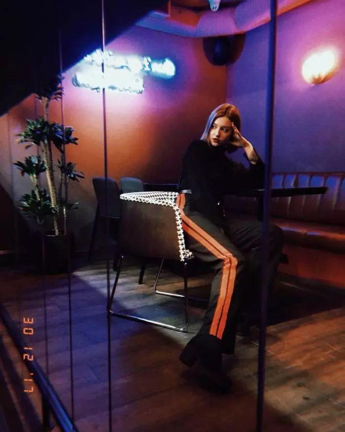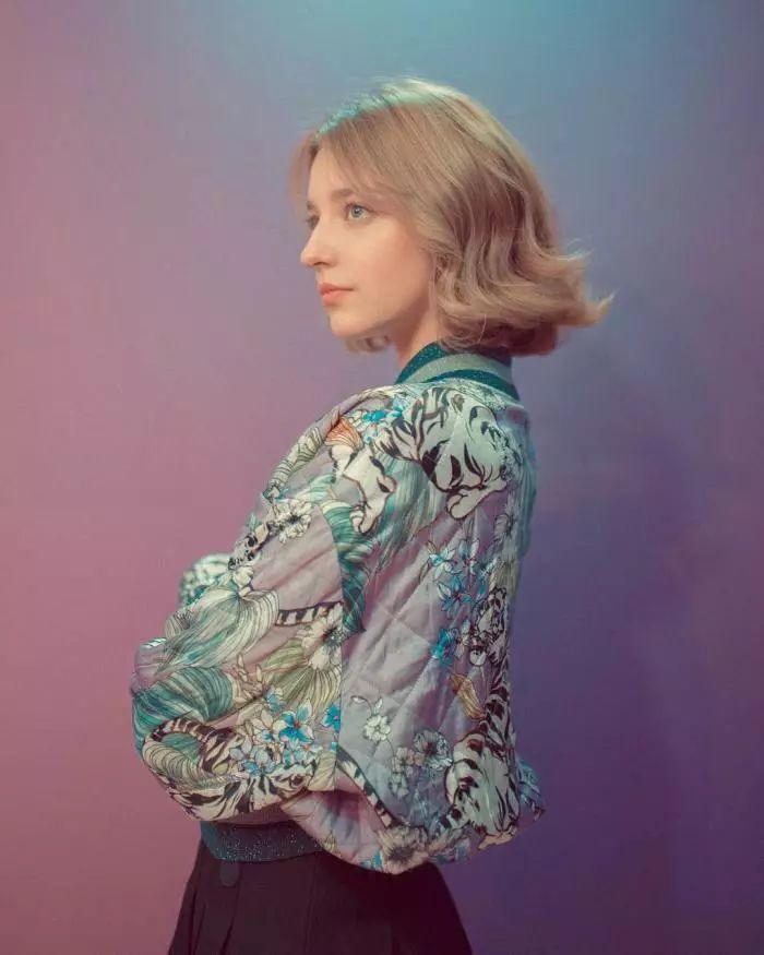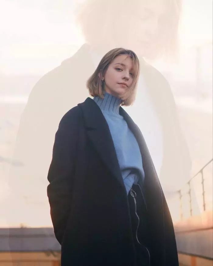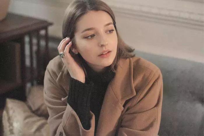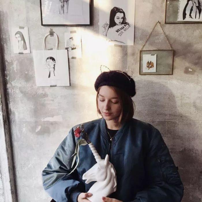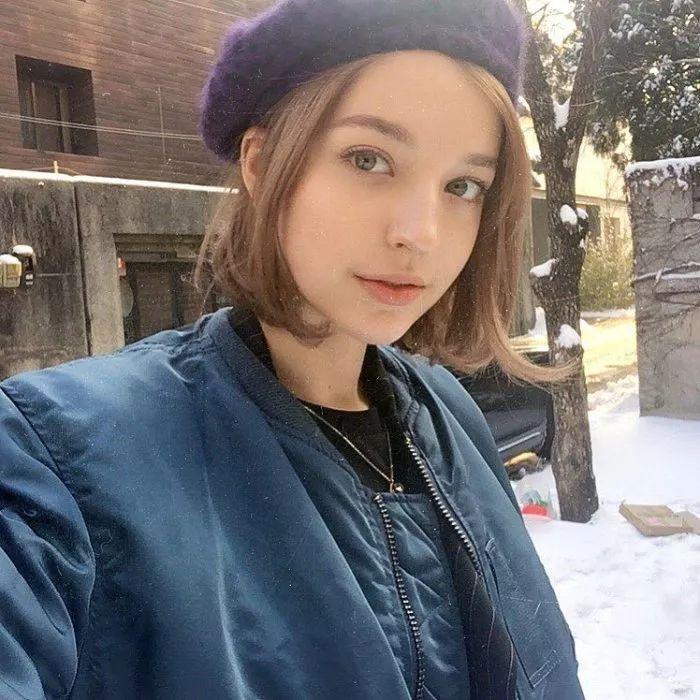发尾微波短发的卷发弧度只有一点点,所以看起来自然感是很强的,参考下图AngelinaDanilova的穿搭,搭配上一个适合发色的贝雷帽也是美的。