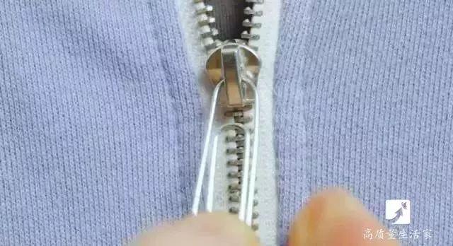 金属的拉链用久之后,拉头便会松动,口径随之变大,就不好拉上了。用镊子夹住拉头的尾部,将其夹紧,不要太用力,夹断了就不好了。