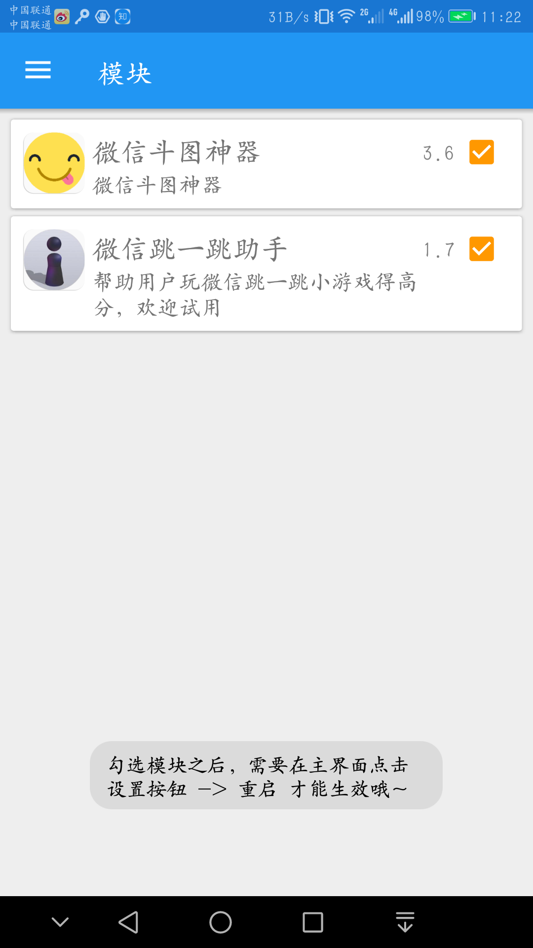 跳一跳助手的设置则需要在打开模块程序更改,启用后只需打开微信小程序便可以享受助手功能(为了友谊,尽量少用)。