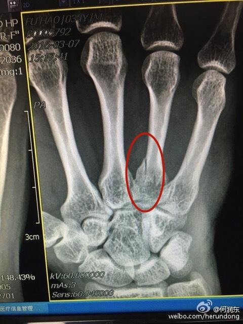 无论怎么看何润东这次的受伤都要比2016年严重得多,那次也是右手,X光片显示无名指有个地方的骨头裂开了,裹了厚厚的石膏,三个星期的时间基本就好完了。