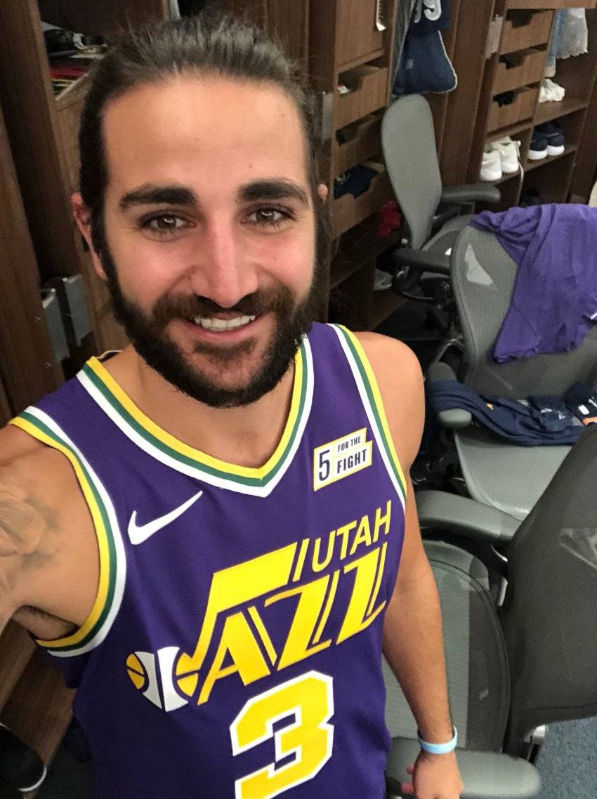 直播吧9月20日讯 爵士队球员米切尔、卢比奥、戈贝尔、费沃斯和克劳德纷纷更新个人社交媒体,晒出印有各自号码的爵士队复古球衣,如图: