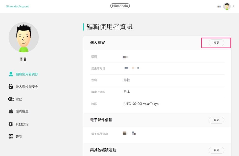 在个人主页的「编辑使用者资讯」栏目中选择「变更」: