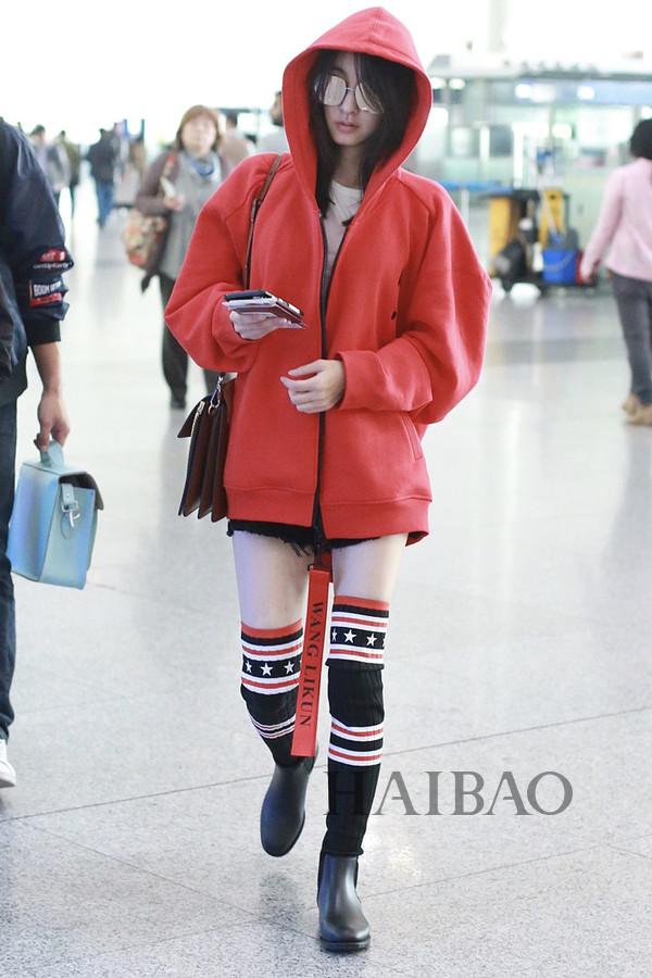 王丽坤机场街拍:身着PeaceBird Women红色连帽拉链卫衣,搭配纪梵希 (Givenchy) 长袜靴