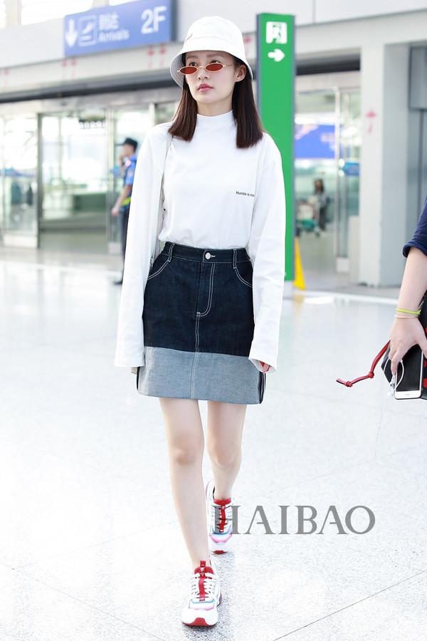 李沁2018年9月14日机场街拍:身着摩安珂 (MO&Co.) 白色立领长袖T恤,搭配Iii Viviniko牛仔半裙,踩李宁 (Li Ning) 启程系列运动鞋,戴Gentle Monster小一号太阳镜与普拉达 (Prada) 白色渔夫帽由上海前往北京
