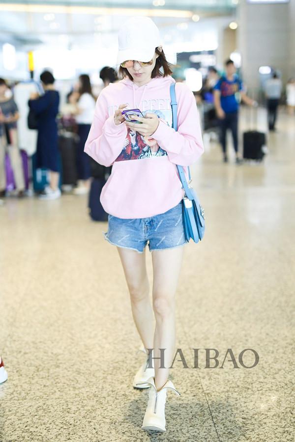 关晓彤机场街拍:身着Miss Sixty牛仔外套与白色连帽卫衣