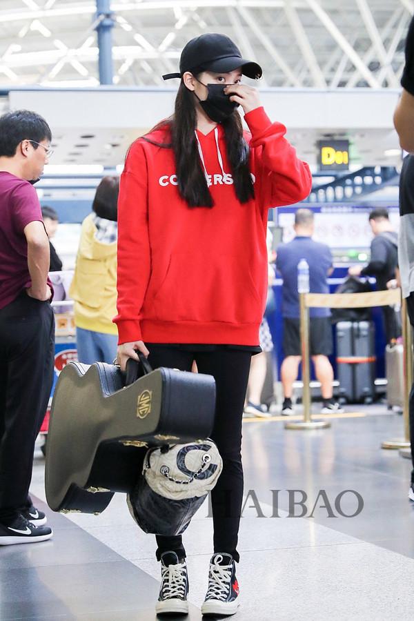 欧阳娜娜2018年9月1日北京机场街拍:身着匡威 (Converse) 红色帽衫,踩Converse × CdG Play联名系列帆布鞋,拎香奈儿 (Chanel) 2018春夏系列手袋