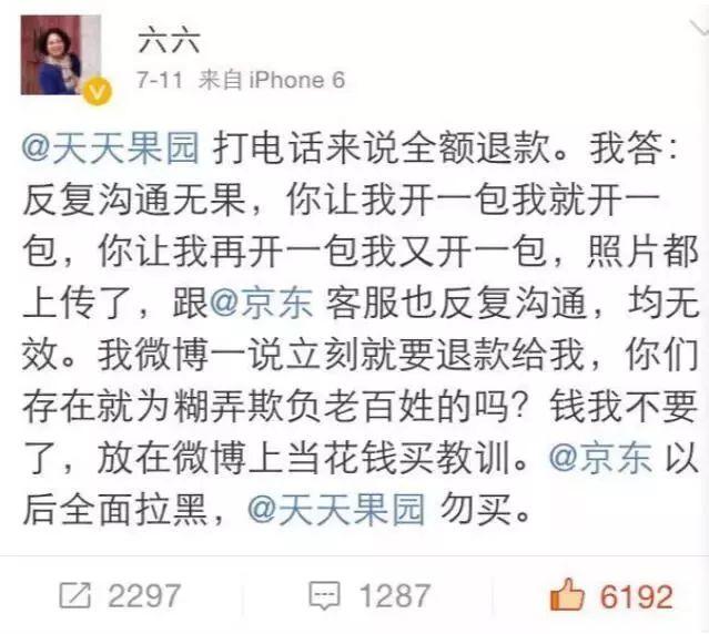 京东旗下的天天果园立马致电六六