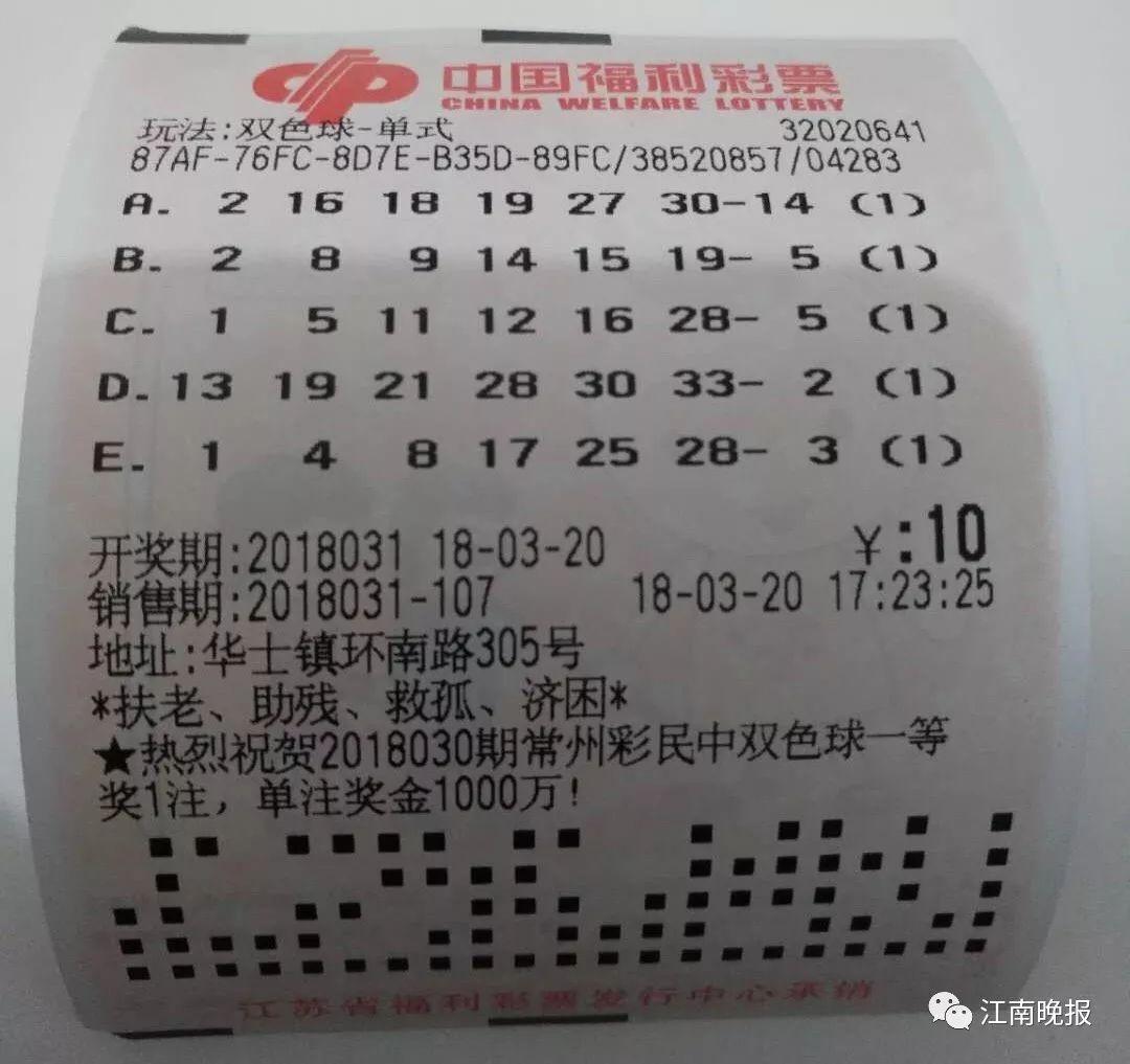 3月20日晚,双色球进行了2018年的第31期开奖,全国中出一等奖3注,单注奖金1000万元。江苏仅有的一注为江阴彩民中得!这是今年江阴彩民中得的第一个千万大奖!