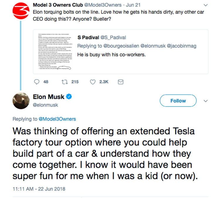 马斯克对这个想法很感兴趣,他说如果我还是一个孩子,亲自参与一辆汽车的制造这对我来说会非常有意思,但是又表示这个项目的运营非常困难。2016 年,特斯拉就曾试图推动一项名为「特斯拉旅游「的法案,但未获成功。