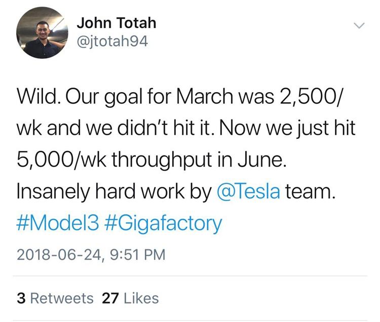 最近 Gigafactory 1 的 Model 3 材料流负责人约翰•托塔 (John Totah) 在 twitter 上表示:特斯拉每周已经可生产 5000 个电池组。很快这条推特就被删除,因为特斯拉规定,任何内部信息在公司没有向媒体宣布之前,不得发表公开评论。尽管如此,我们还是看到了,以下是原文: