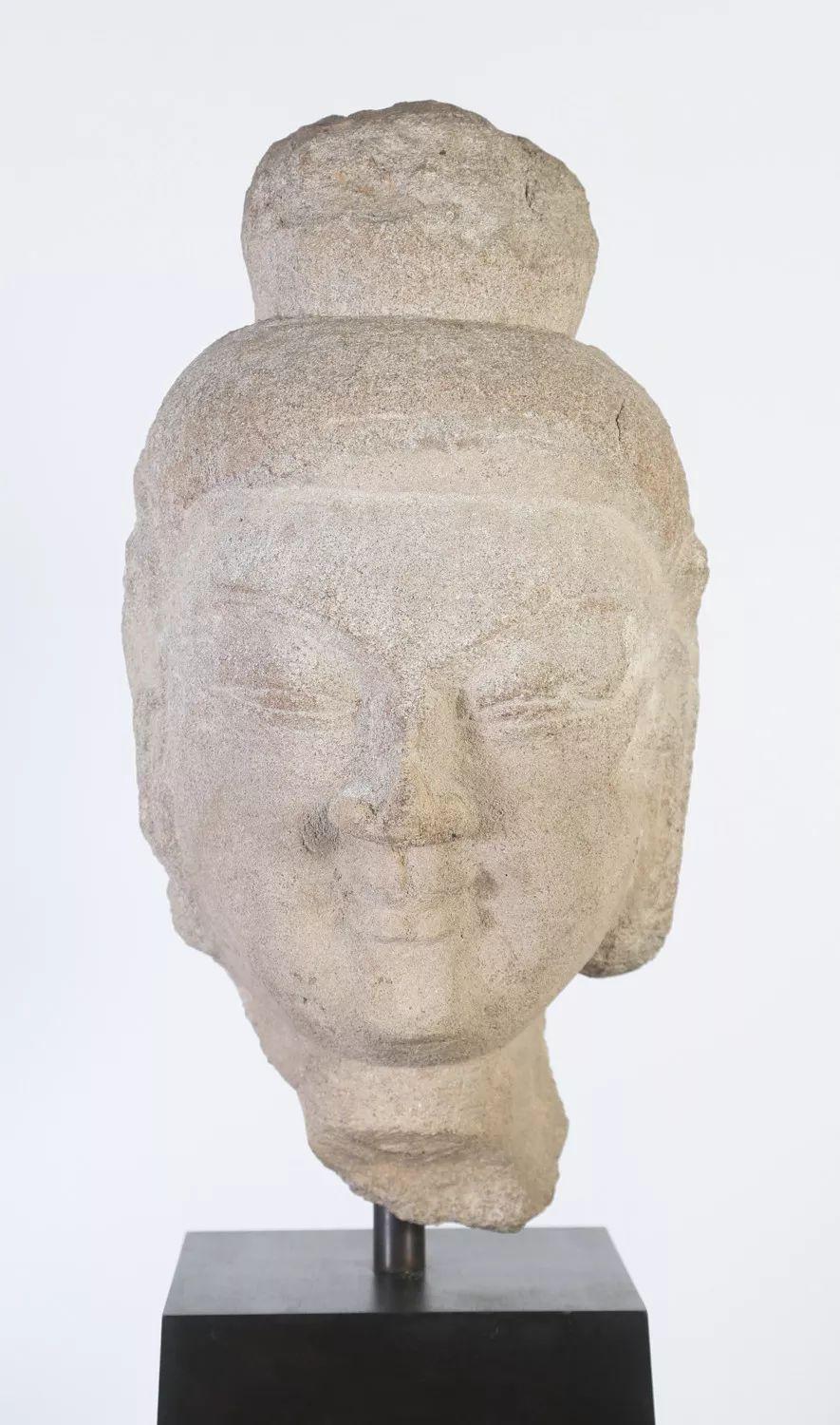 这尊北魏时期的佛首无论从其砂岩材质还是其造像风格都与山西云冈石窟风格相类似。佛像头顶肉髻,面容清矍,细眉长目,鼻梁高直,口唇似笑非笑,面相慈蔼,表情平静。